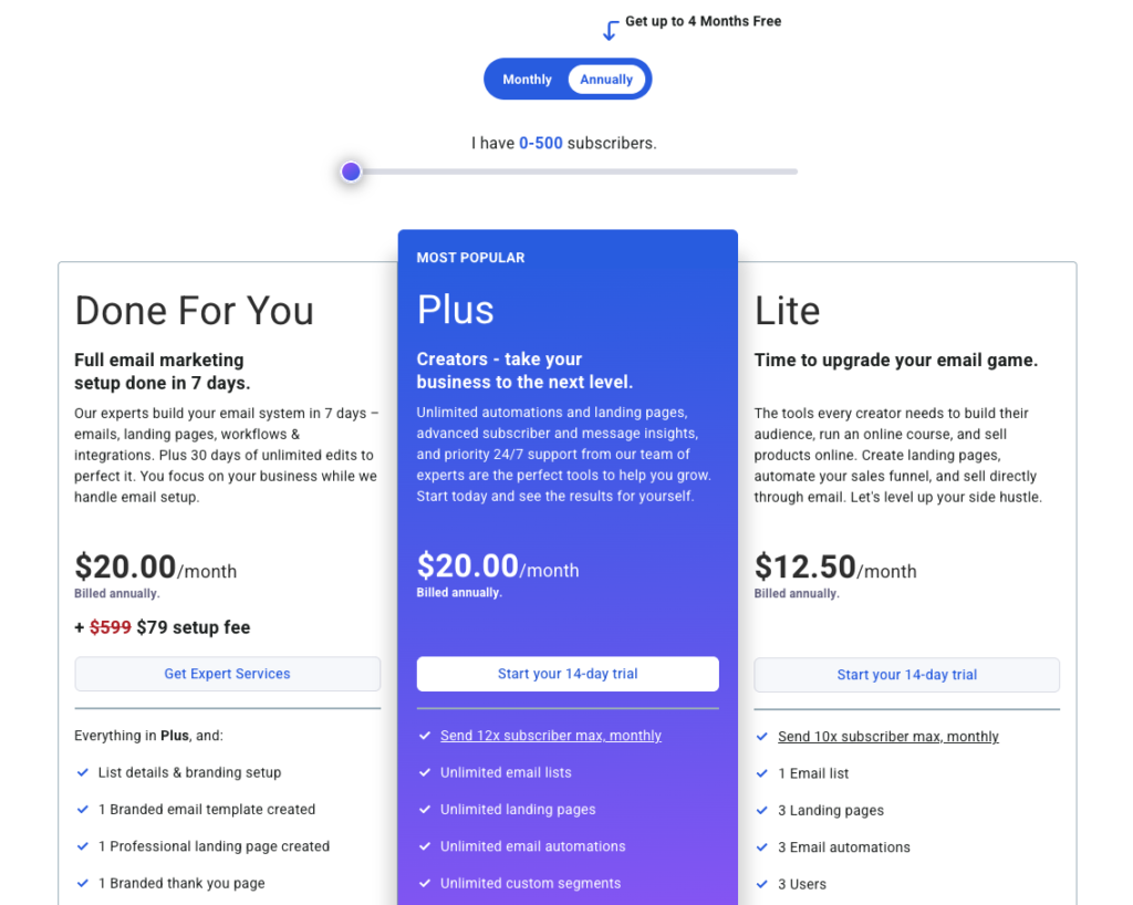 Budget for where you’re going, not where you are. Email pricing rises as your list grows, so pick a plan you can live with at the next milestone.