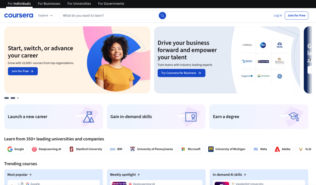 Coursera offers several learning paths that stack from short courses to full degrees. You start simple, then build depth with projects and capstones. The catalog includes content from Google, IBM, Meta, Salesforce, and top universities like Stanford, Duke, and the University of London.