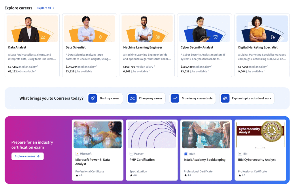 Coursera fits students, career switchers, and working professionals. If you want a direct path into entry-level tech roles, Professional Certificates are the sweet spot. If you want credit from a university, look at MasterTrack or Degree programs.