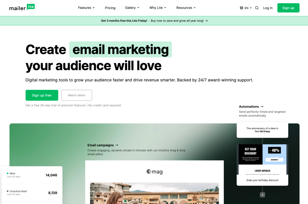 MailerLite works well for weekly newsletters, lead magnets, basic funnels, and small digital product sales. You can spin up landing pages, deliver a free guide, and send a short welcome series without touching code.