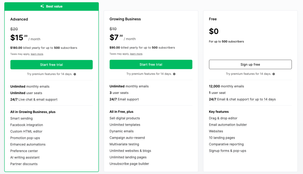- Mid and higher tiers (growing and serious growth): For larger lists and teams. These bring in features such as advanced automations, more sites, extra users, and higher priority support.