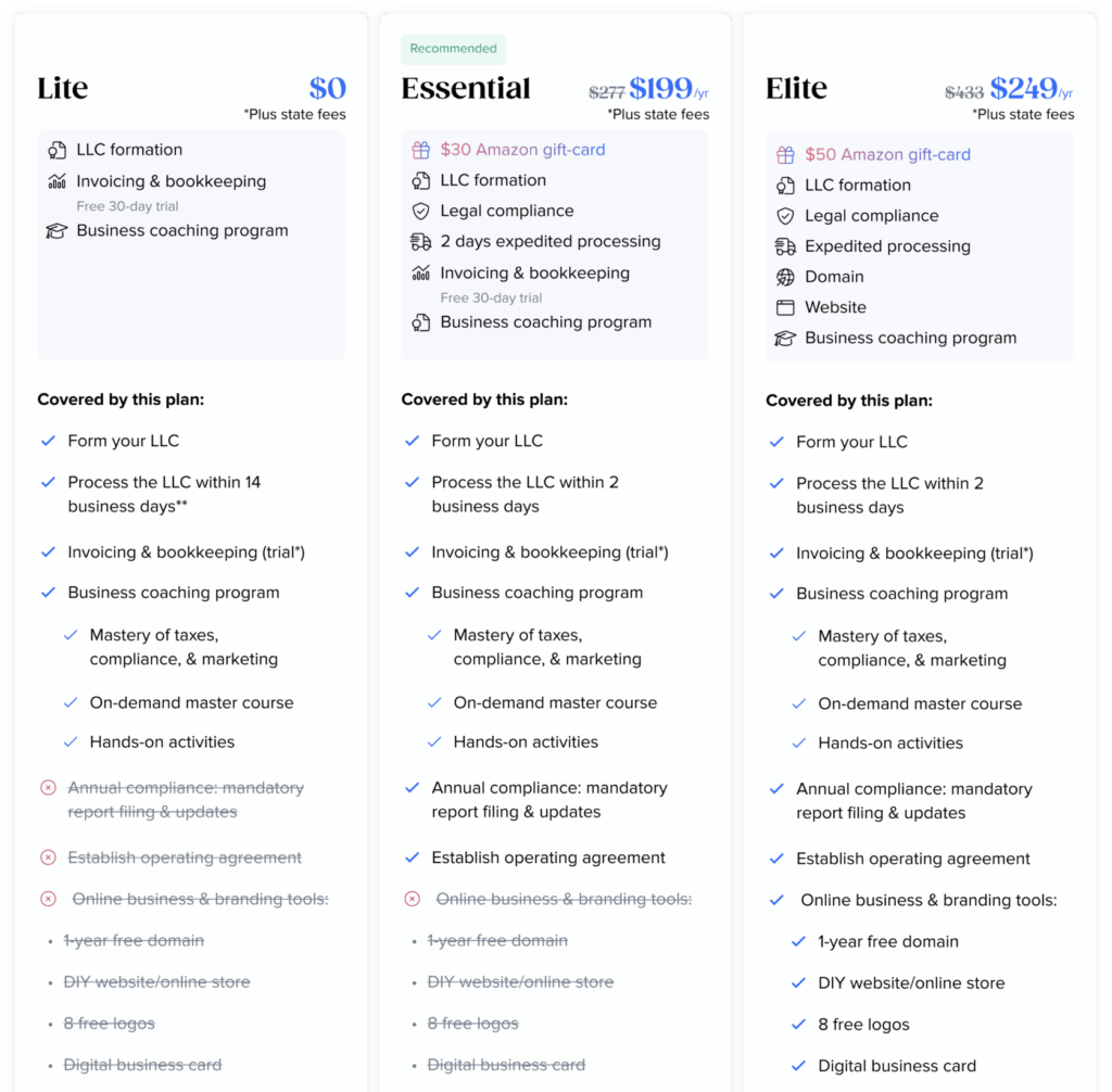 Some parts are billed monthly or yearly, such as brand tools and the website. Others, like filing an LLC, are one-time services, yet you might pay recurring fees for things like a registered agent or ongoing compliance support. The pricing looks fair on first glance, but you should expect upsells, add-ons, and auto-renewals unless you turn them off.